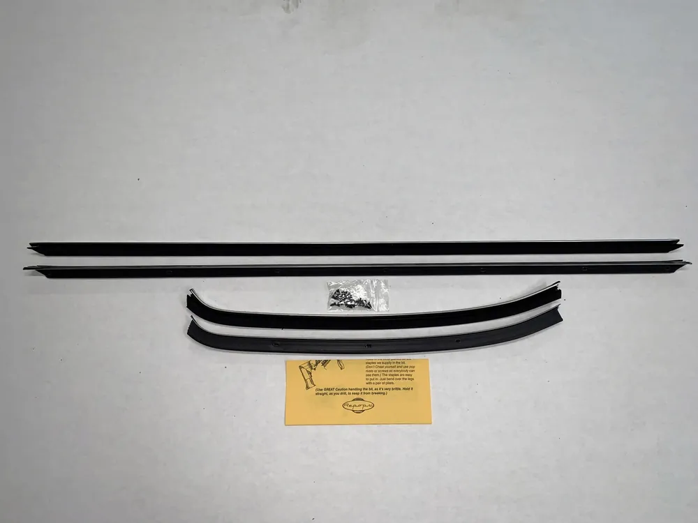 A window sweep kit is a set of replacement seals for classic car doors and windows. These sweeps help keep out water, dust, and wind while allowing the window glass to move smoothly. Replacing worn sweeps restores proper sealing, reduces interior noise, and protects door panels from moisture damage.
