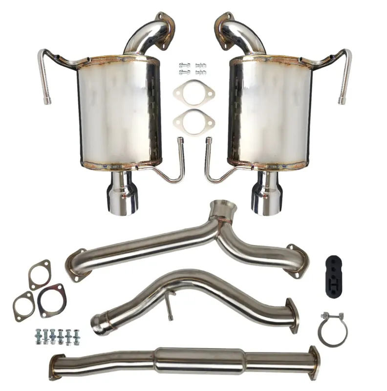 The twin mufflers are constructed fully of stainless steel with 63mm (2.5″) piping from the y-pipe.The dual mufflers give a great sound out the rear with the AVO 4″ round-rolled adjustable exhaust tips.The front section of the cat back is 3″ with a resonator, which then runs into a y-section that is twin 2 1/2″.