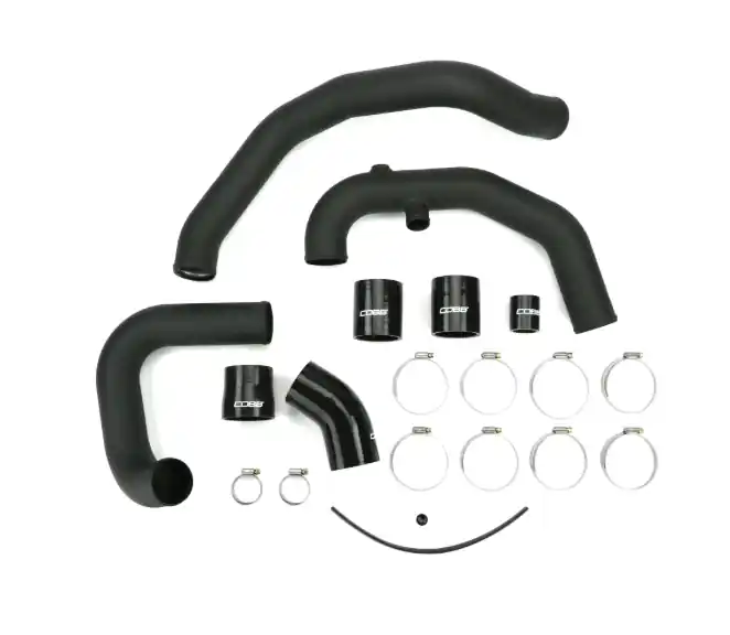 Crafted from durable aluminum with a 2.5″ diameter, the piping features smooth bends and a sleek powder-coated black finish for both longevity and style. The kit includes an integrated Intake Air Temperature (IAT) sensor bung and a built-in blow-off valve (BPV) flange, along with black silicone couplers and new clamps to ensure a seamless, hassle-free installation. Ideal for those who already have a COBB Front Mount Intercooler Core or want to elevate their intercooler efficiency.