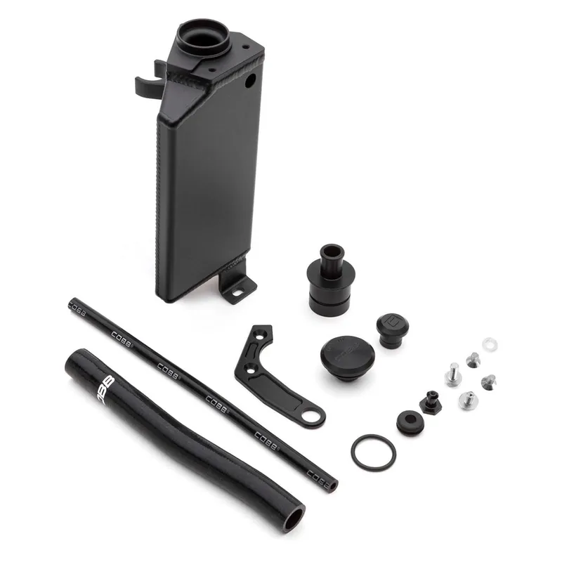 The OEM Coolant Overflow Tank for the 2008-2014 WRX/STI does its job well enough but the cheap plastic material is ugly and will potentially crack over time, especially when driving hard and going through extreme heat cycles. Its shape is also clumsy and obtrusive when adding an aftermarket FMIC. The upgraded COBB Subaru Coolant Overflow Tank solves these problems without any sacrifices. Constructed of welded aluminum with a capacity of .8L, similar to the OEM tank, along with internal and external anodizing. The COBB tank looks much better under the hood while providing a very simple relocated mounting solution that works perfectly fine on a stock car. Its shape is also more conducive to fitting piping from an aftermarket Front Mount Intercooler. A custom COBB Delrin cap is included which is highly heat resistant and adds to the overall clean look. Plus, the kit comes with a silicone adapter hose and injection molded cap for the washer fluid reservoir, giving a uniform look.