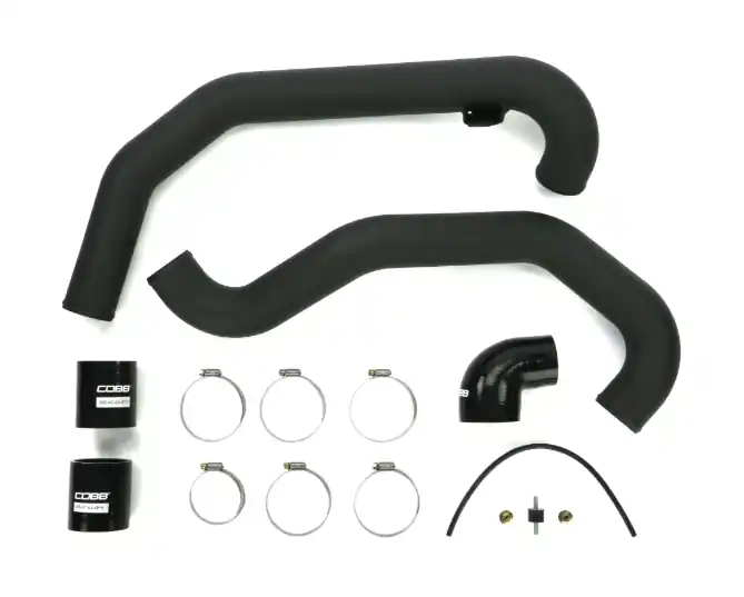 Crafted from durable aluminum with a 2.5-inch diameter, the piping kit features a sleek powder-coated black finish for corrosion resistance and style. It includes black silicone couplers and clamps to ensure a secure, leak-free fit. Compatible with the COBB SF intake system (note: SF airbox trimming required), this kit is ideal for custom turbo builds or performance upgrades.