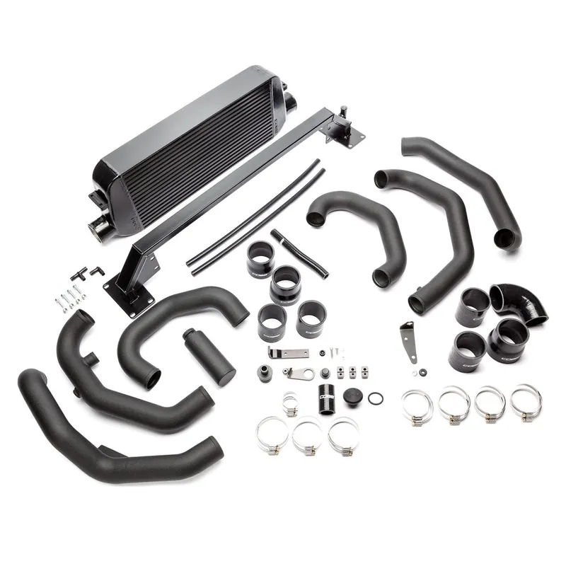 Remove the overworked factory intercooler from your 2015+ STI in favor of the Black COBB Front Mount Intercooler Kit. Featuring a massive 24″ x 11″ x 4″ Bar and Plate core and 2.5″ piping. The intercooler core is finished in a black heat-dissipating coating. The piping is mandrel bent aluminum and finished in wrinkle black powder coat to keep the engine bay looking tidy. An included BPV adapter plate will allow installation of the factory bypass valve, COBB XLE BPV, or any bypass valve with factory-like fitment. The cold side piping includes an integrated bung for an Intake Air Temperature sensor which makes for a straight-forward Speed Density conversion. The COBB FMIC is designed to work with the COBB SF Intake and Airbox combination. Compatibility with other intake kits cannot be confirmed. A feature unique to this intercooler kit is the integrated mounting provision for a factory tow hook or license plate relocation bracket. No cutting to the bumper cover is required when installing this FMIC Kit. Factory side crash supports remain in place.