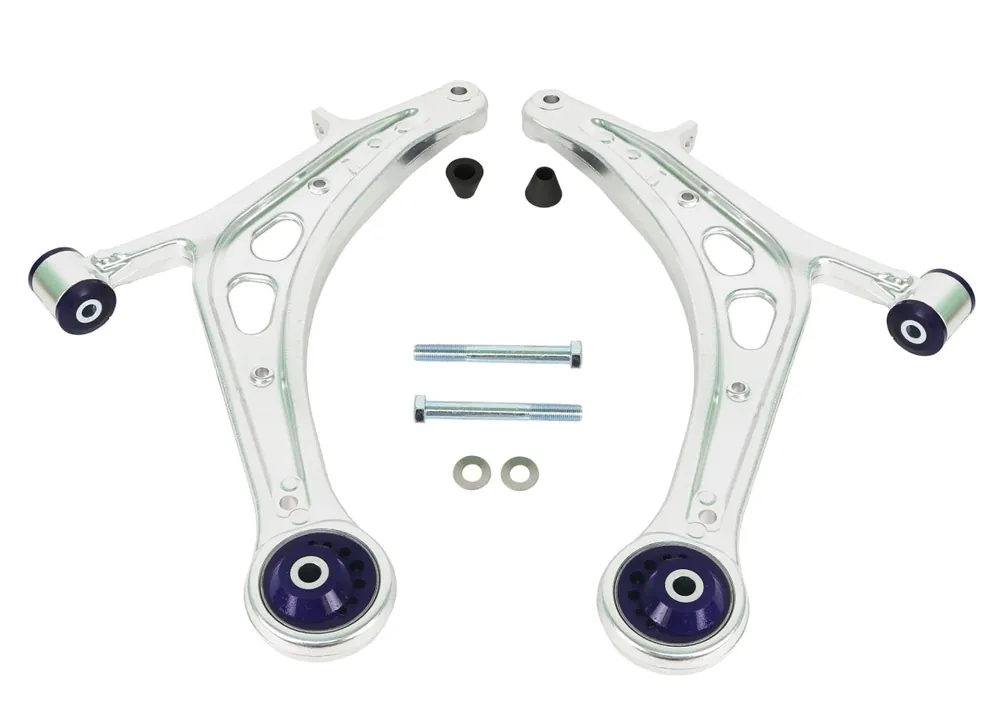 The kit features pre-installed SuperPro bushings in the forward position and SuperPro’s caster offset DuroBall bushing assembly at the rear, optimizing geometry for additional caster and anti-lift benefits. The alloy arms provide enhanced rigidity and a slight weight reduction compared to OEM steel arms. New OEM-style ball joint bosses simplify installation by preventing seizure issues common with factory arms. Sold in pairs, this kit is a direct bolt-on upgrade for enthusiasts seeking better front-end grip and durability.