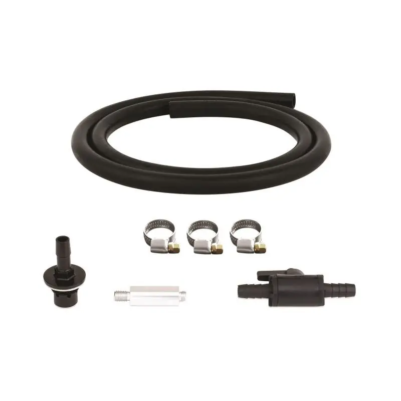 Crafted from durable 6061 aluminum with CNC machining, the barbed outlet features multiple through holes to maintain catch can functionality. The kit includes a 3/8” black nylon ball valve, 6 feet of flexible black rubber hose, and three worm-gear clamps for easy installation and secure fitment. Designed specifically for Mishimoto baffled oil catch cans, this kit ensures reliable performance and longevity backed by Mishimoto’s Lifetime Warranty.