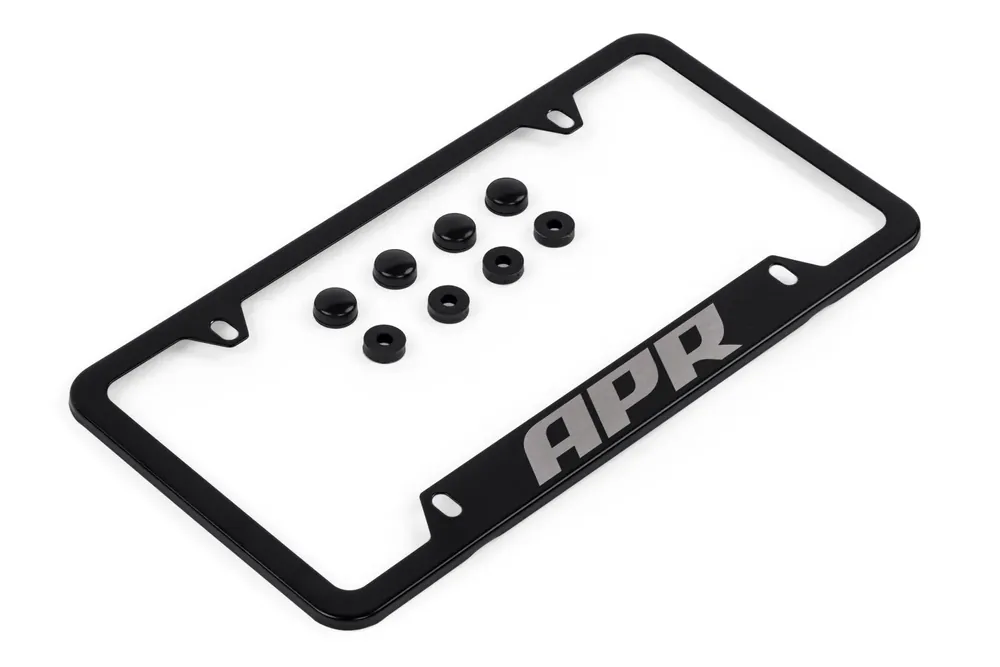 APR license plate frames and vanity plates are the perfect addition for any APR tuned vehicle! They are made from sturdy and rust-resistant T304 stainless steel. They are thick enough such they won’t flop around like throw-away handouts you find in a typical swag-bag at car shows. They feature a fade and scratch resistant black powder coated finish with laser etching for the APR logo. Anti-vibration backside plate tabs keep it firmly in place. Four slotted install holes give you the perfect fitment with a solid connection to the car. The nice hardware hiders give it a clean finish too, hiding your unsightly plate screws. Fitment is universal. Some have said this product will increase the value of the vehicle, while others have made horsepower gains, but we can’t comment on either.