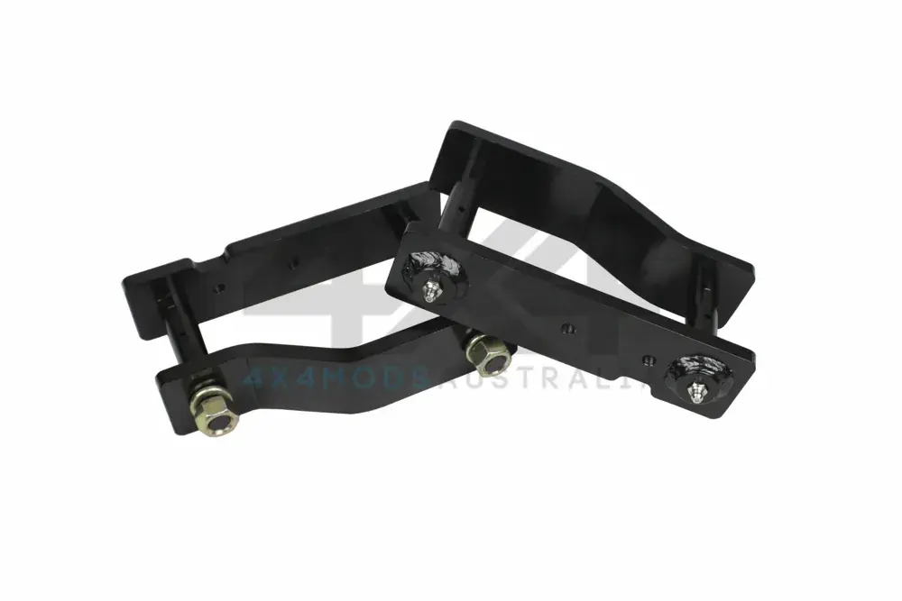 PSR’s extended shackle for Toyota Hilux N80 15-on model is a super heavy duty leaf spring shackle. Designed to a length that provides 1″ of lift it features side plates made from 10mm steel, CNC machined and welded pins. Pins are greaseable for a long service life. Welded design is far superior to other designs on the market as it reduces shackle walking and flexing under load. Others are designed around a centre welded support with no outer support where it is needed. Has provisions for the factory headlight aim bracket to be refitted. Coated Black to blend with the chassis.