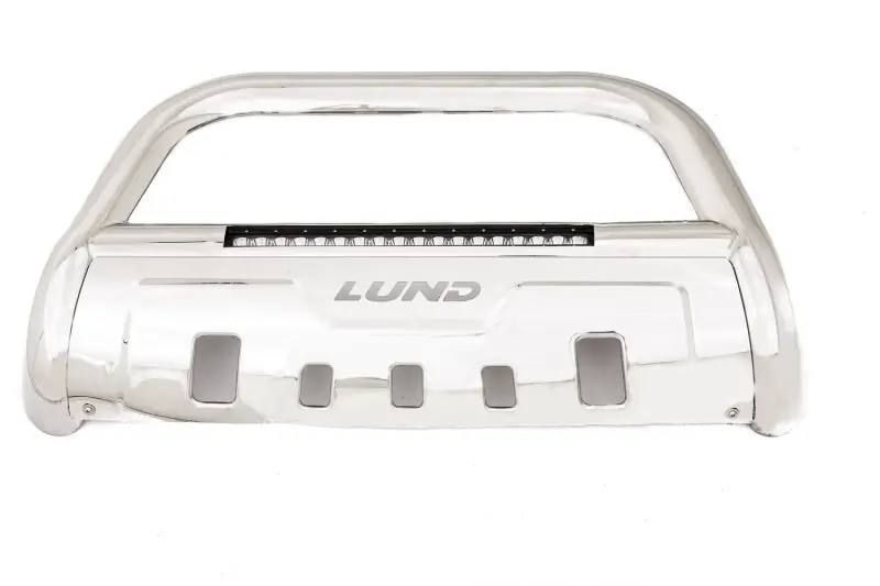 Protects your front end from flying debris with 3.5inches of oval steel tubing. These bull bars also boost your visibility with an integrated 20in. LED light bar. The included heavy duty light bar illuminates your night driving with a bright flood beam pattern and is easily wired into your factory light wiring, or a wiring harness can be purchased separately. Available in black textured powder coat or polished T304 stainless steel finish. Our popular LUND bull bars may now be ordered with a wire harness kit.The wire harness kit is also sold separately for lighting and accessories up to 30 Amps.LUND’s bull bars with LED light bar and wiring kit is the total package to ‘see and be seen’, providing complete front end — style, lighting and protection.