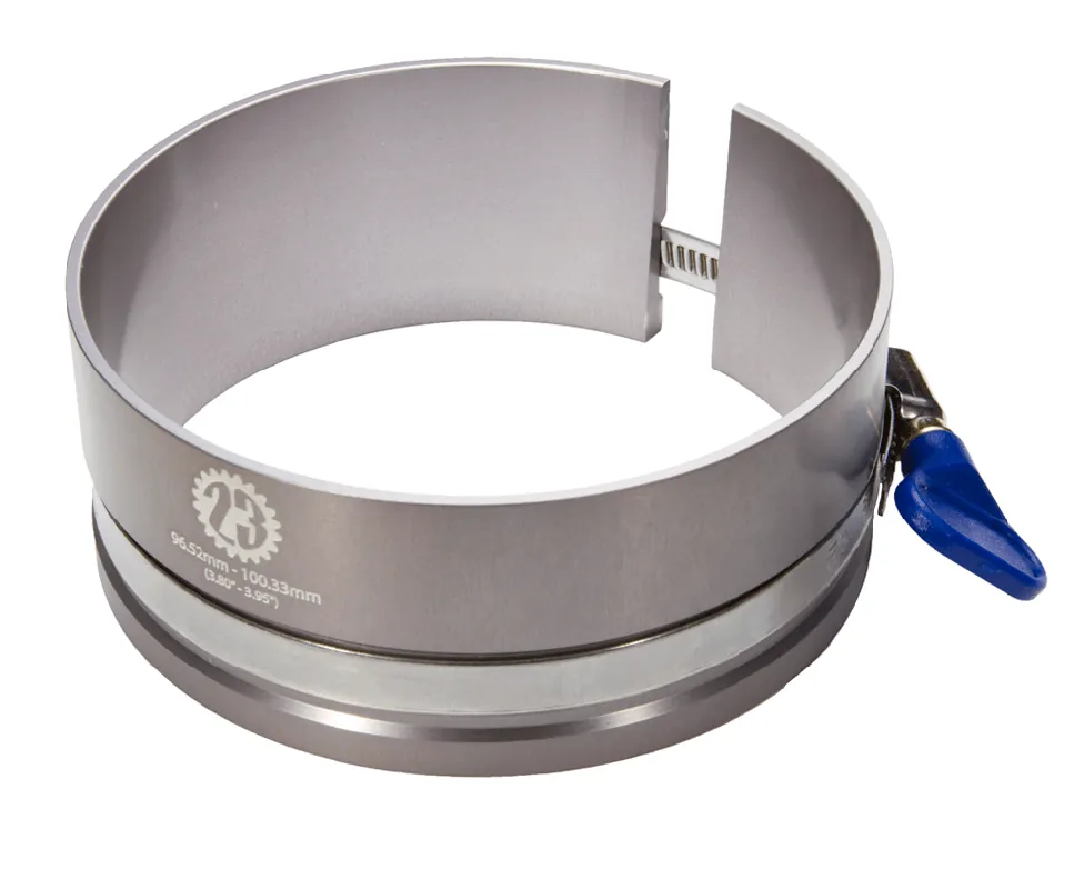 Crafted from aerospace-grade alloy and CNC-machined for durability, the compressor features a gradual billet taper design that guides pistons safely into the bore. Its adjustable diameter fits stock and oversize pistons ranging from 96.52mm to 100.33mm (3.80″–3.95″), and the tool-less thumb adjuster allows quick, hassle-free size changes. This robust design ensures long-lasting performance and precise alignment during installation.