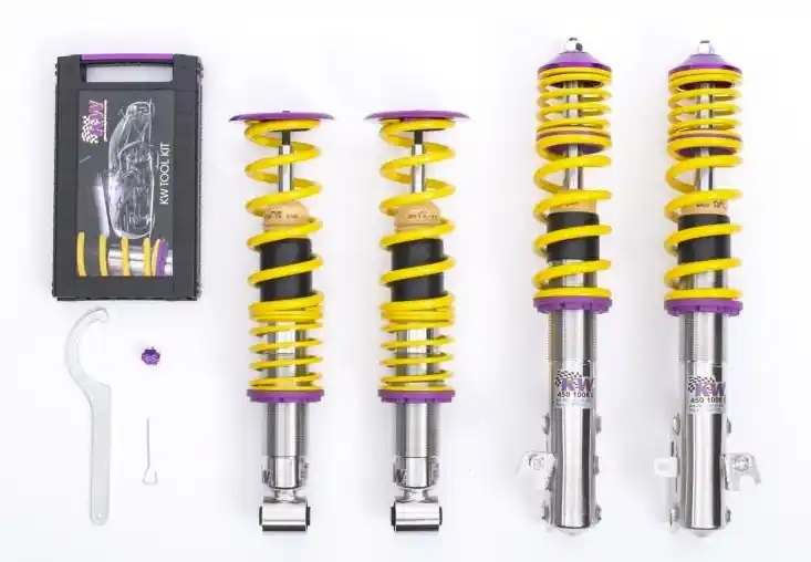 The KW Coilover kit Variant 1 “inox-line” is KW’s entry model. These coil overs were designed with the primary focus being more driving pleasure, while still offering adjustable lowering. Due to their high-quality finish, the use of struts made from stainless steel, corrosion-resistant springs, and bump stops, these coil overs will stand the test of time and last you just as long as your vehicle.