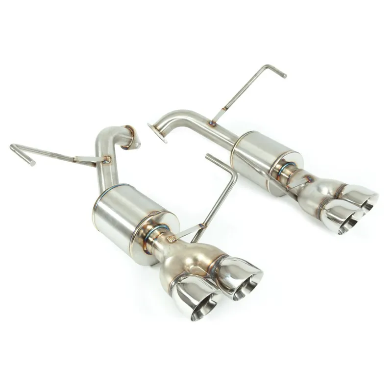Factory fit laser cut flanges and 2″ dual piping has equivalent flow characteristics of a 3″ single straight pipe, providing excellent breathing characteristics for high end horsepower and generating an increase in low end torque (roughly 10hp/11ft lb at the wheels for this and the other muffled axleback options we offer).