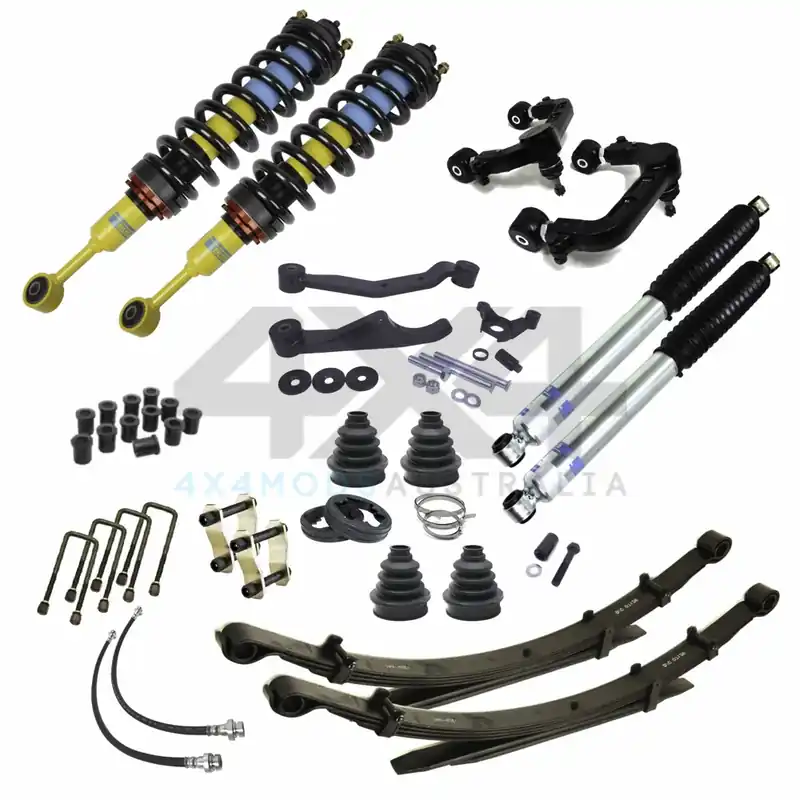 This kit utilises 2 – 4″ PSR Bilstein custom adjustable height front struts with Kings coil springs, PSR adjustable upper control arms, PSR arm style diff drop, PSR high clearance outer CV Boots, 2″ 500kg constant rear leaf springs, rear Bilstein shocks, bushes, U-bolts, shackles and an extension for the brake lines.