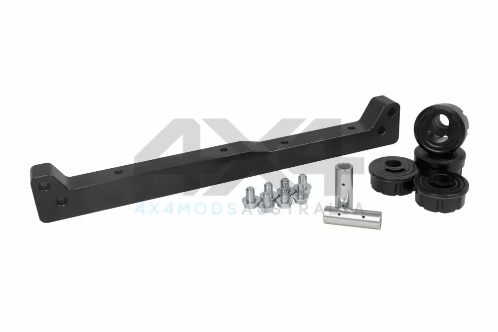 PSR’s Nissan Navara D22 diff drop is a solution that allows lowering of the diff to reduce CV angle when a lift is installed. The front OE pressed steel crossmember is replaced with a solid BV408xmm CNC machined crossmember and is designed to bolt-into position without modification and accept the OE bash plate if required. The front rubber bushed diff mounts are re-used and bolted to the new crossmember but in the rear crossmember a Polyurethane bush is used for 2 benefits, first is to drop the rear of the diff down as the crush tube is offset and the second is to locate the diff to reduce diff movement under torque, thus reducing the risk of further CV damage due to the joint pulling apart while in motion. The front crossmember plus the rear offset bushes combine to drop the diff down and reduce CV angle to give greater joint life and reduce the risk of damage when off-roading.