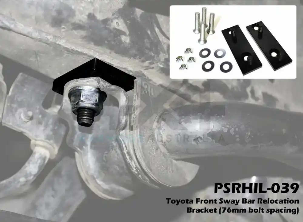 PSR’s Toyota Hilux N70 05-15 front sway bar relocation system is designed to allow more clearance from the sway bar to the strut assembly and are 100% bolt-in. Unlike other brands our kit features countersunk bolts and press in studs to reduce the thickness of the main plate meaning the possibility for contact between the sway bar and the radiator supports is eliminate, or only minor. Supplied with studs pre pressed into the plate for easy installation and removal they are E-coated Black and come with all required components to install. Mounting bolt centers are 76mm. May be required when installing PSRHIL-011.