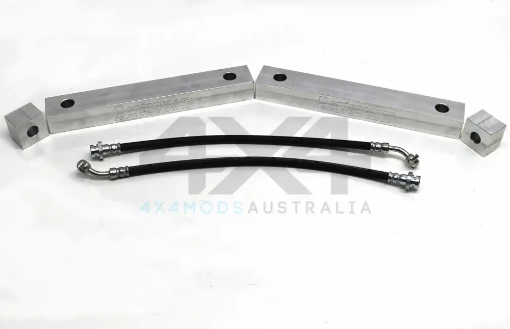 PSR now offers a rear crossmember lift system which allows the Pathfinder to be lifted over 2″. The rear suspension on this vehicle has very short control arms and there is no shock available to accept a larger than 2″ lift. The kit includes CNC machined alloy blocks which bolts in-between the crossmember and the chassis and gives an extra 1.5″ lift. This can be coupled with our front suspension products such as, strut spacers, extended ball joints and raised shocks and springs to achieve an overall 3-4″ lift all round. Also this kit can be used on a standard height car if suffering from bad positive camber as a way to keep standard wheel alignment settings, as when using this spacer kit, the wheel alignment settings remain unchanged. Kit comes with four machined blocks, six bolts and extended brake lines. Pinion angle is not effected when installing this kit.