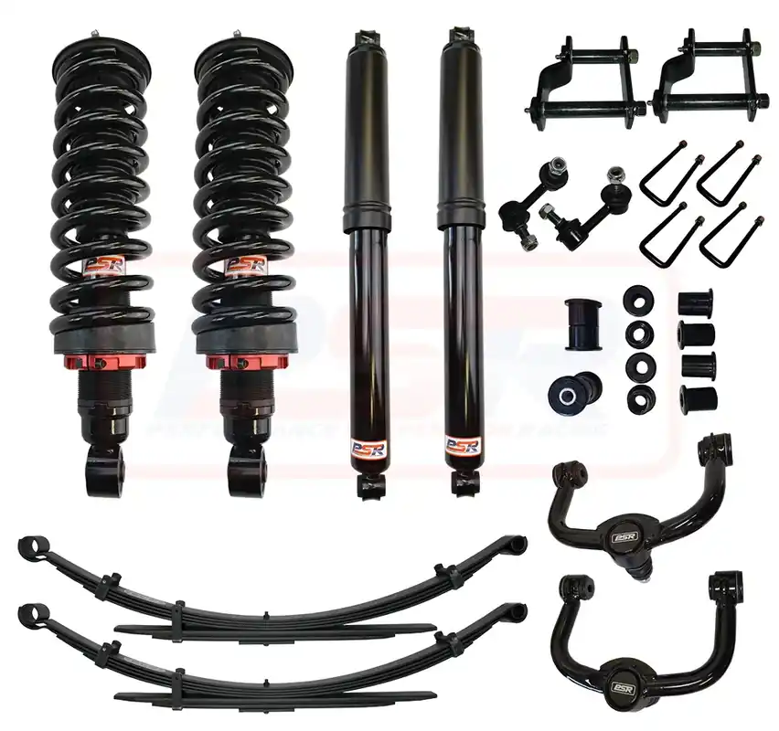 This system sits at 3″ front and 2″ rear to sit the car level and contains our custom height adjustable PSR TTG front struts fully assembled with Kings coil springs and PSR HD top mounts, PSR upper control arms, HD front sway bar link pins, 250kg constant load 2″ leaf springs, greasable shackles, bushes, U-bolts and PSR TTG rear shocks.