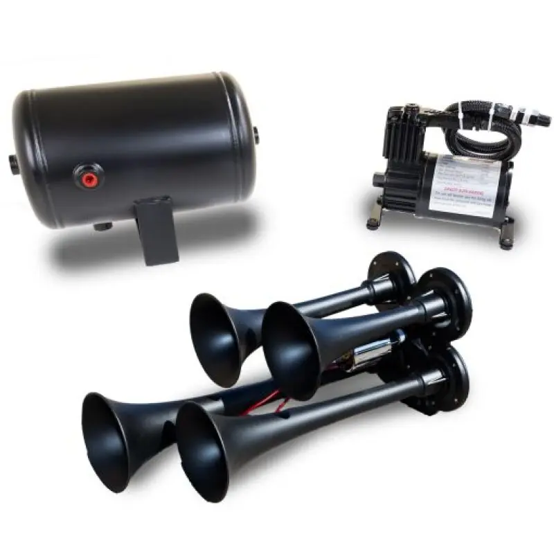 Quad black air horn with four tuned trumpets 13, 11, 8.5, and 7 in length. Additional trumpets create a more fully-blended tone while being compact enough to fit almost any vehicle. Includes an easy-to-fit, 130 PSI, 1 gallon air system.