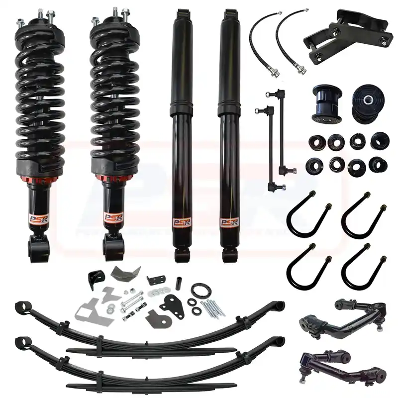 This system sits at 4″ front and 3″ rear to sit the car level and includes our PSR diff drop kit, PSR shortened link pins, PSR adjustable upper arms, PSR TTG height adjustable 2 – 4″ struts, King coil springs, leaf springs, leaf spring bush kit, 1″ lift extended shackles (bringing the rear level), extended brake lines and long travel PSR TTG shocks. This kit includes our weld in diff drop which is highly recommended when raising the vehicle 3″ or above to save the CV joints from damage due the immense strain put on them at the increased angles.