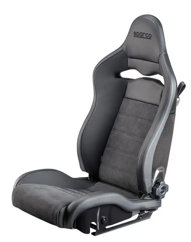 The SPX seat features a reclining design with a micro adjustment knob for precise positioning, ensuring optimal driving posture. Its tone-on-tone black stitching and embroidered Sparco logo add a sleek, subtle finish. The Alcantara center panel provides excellent control, making it ideal for spirited driving or track use. This seat is the first carbon fiber reclining model available to the public that meets OEM supercar specifications.