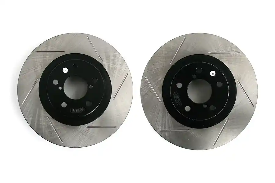 If you’re currently in the market for an excellent brake rotor replacement for your warped or damaged OEM rotors, then you will be pleased with the Stoptech Slotted Brake Rotors. These are high-performance replacements designed with the latest in braking technology to improve your stopping performance. When compared to OEM rotors, Stoptech’s slots will wipe the surface between the pad and the rotor expelling hot gases and brake dust to provide a clean contact patch. This means more bite on the street with more performance during spirited driving conditions.