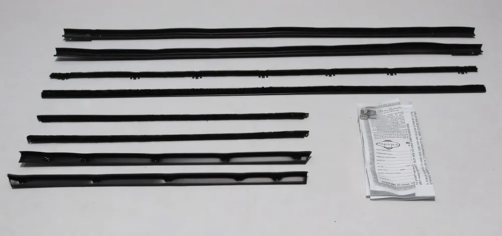 A window sweep kit is a set of replacement seals for classic car doors and windows. These sweeps help keep out water, dust, and wind while allowing the window glass to move smoothly. Replacing worn sweeps restores proper sealing, reduces interior noise, and protects door panels from moisture damage.