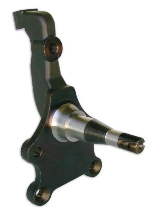 The RideTech spindle is a heavy duty forging that is approx. 1.75″ taller [balljoint to balljoint] than the OEM spindle. This basic geometry change increases the camber gain during suspension compression [allows the tire to lean into the turn instead of away from the turn]. The RideTech spindle also has a pin height that is 2″ higher than the OEM spindle. This means that your car will sit 2″ lower than it would with the OEM spindle.