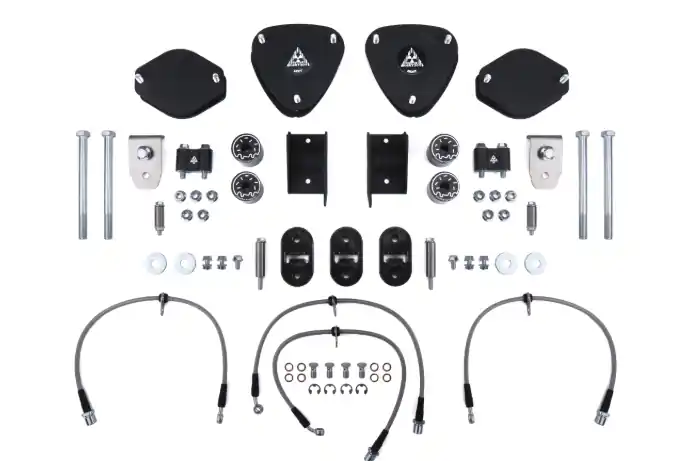 The kit also features replacement steel-braided front and rear brake lines at a corrected length appropriate for the additional height. The new lines prevent kinking at full droop and binding at full compression – plus you get improved pedal feel. The ‘just right’ of brake lines for the all-around win.
