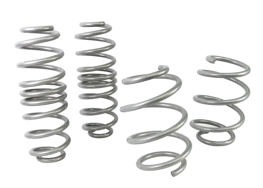 Whiteline Springs deliver improved vehicle performance whilst maintaining safety and ride quality characteristics. This kit contains 3.3kg/mm (185lb/in) front rated springs that provide a 25mm drop while the 2.9kg/mm (162lb/in) rated rears deliver a desirable 25mm to the vehicle. By lowering the vehicles centre of gravity, the unique and progressive rate coil design not only improve performance but enhance overall appearance. Developed and manufactured in Europe from the highest quality materials, coating and to the finest tolerances guaranteeing exact fitment. Whiteline Springs are engineered for optimal balance with OEM and aftermarket shocks. For total grip activation match with Whiteline Sway Bar and Essentials kit for unrivalled handling and optimal vehicle performance.