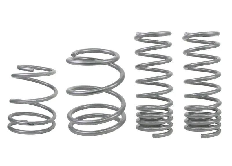 The kit includes front springs rated at 4.9kg/mm (274lb/in) and rear springs at 3.7kg/mm (207lb/in), featuring a unique progressive coil design that maximizes grip and control. Manufactured in Europe with high-quality materials and precise tolerances, these springs fit seamlessly with OEM and aftermarket shocks. For optimal handling, pair this kit with Whiteline sway bars and essential suspension components.