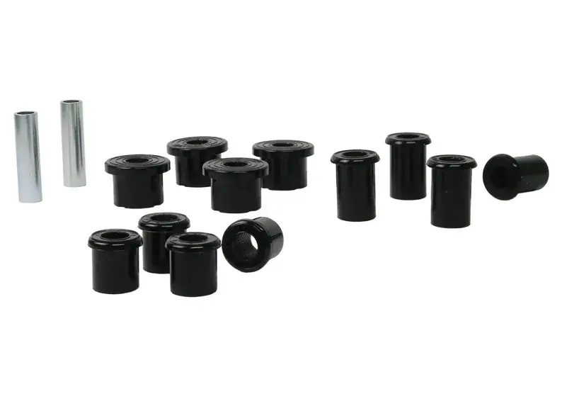 All in one leaf spring bushing service kit covering front and rear eyes of the leaf plus shackle bushings. High kilometres and heavy load carrying causes excessive wear on rubber bushings. Whiteline’s signature black bushings are made tough and offer outstanding abrasion resistance, high load bearing capability (4WD’s, utes and towing), flexibility, increased tensile strength and chemical resistance to oil, grease, ozone and weathering.