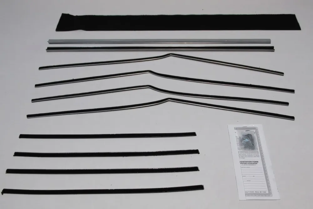 A window sweep kit is a set of replacement seals for classic car doors and windows. These sweeps help keep out water, dust, and wind while allowing the window glass to move smoothly. Replacing worn sweeps restores proper sealing, reduces interior noise, and protects door panels from moisture damage.